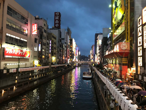 Taken at one of my most favourite places in Osaka, during a rainy night, you can see the different bright neon colours bouncing off the water.