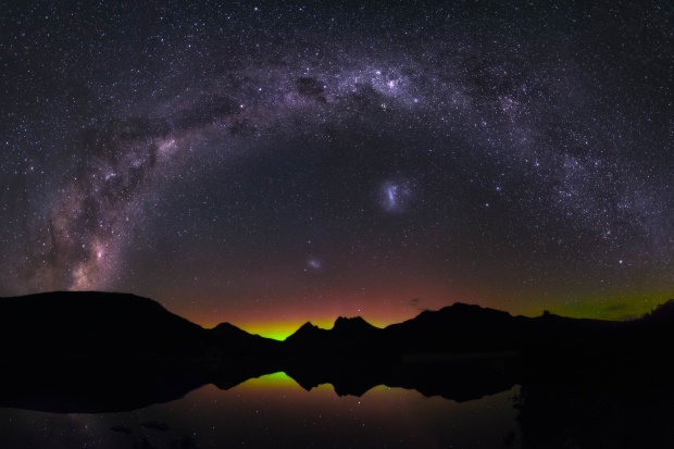 The aurora glows behind the silhouetted peaks of Cradle Mountain, with the Milky Way arching perfectly over the top, as the scene is reflected perfectly in the still waters of Dove Lake.