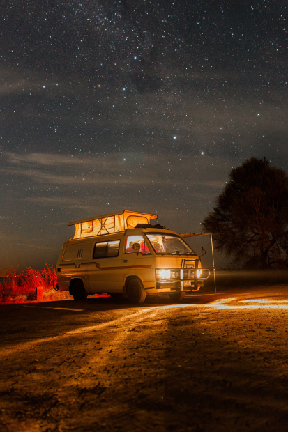 This photo was taken at 12:00 am I was supposed yo be in bed, but felt like going out for a piss, while I’m out couldn’t believe my eyes how hood was the whole scene of the van and the stars. So took my camera out, woke up my parntner to turn the lights on and off for couple of seconds for my long exposure, and it worked. Created a nice lights, and the red was from the back lights which gave the image a special feature. This night was unforgettable.