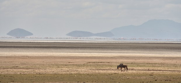 A lone wilderbeast walks along an edge of an ever shrinking lake.
