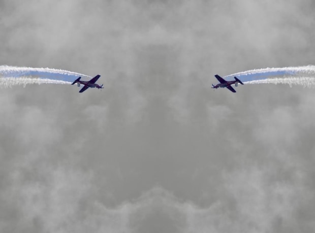 Two paths across the sky—mirrored yet independent—remind us of the mystery and beauty of things that fly.