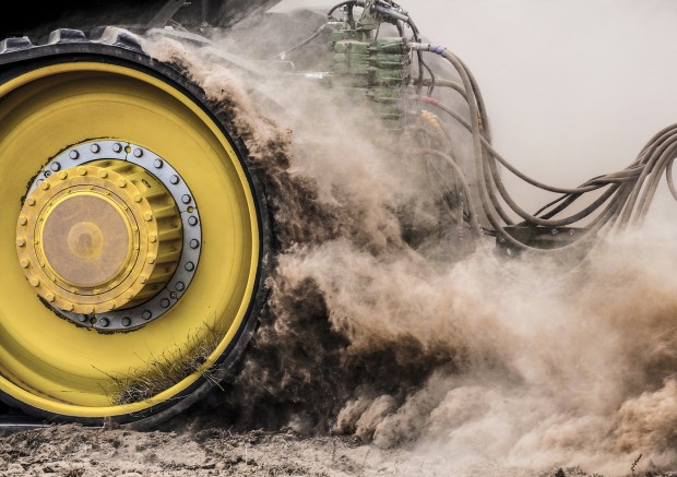 A photo of a wheel of a tractor sowing a very dusty paddock.