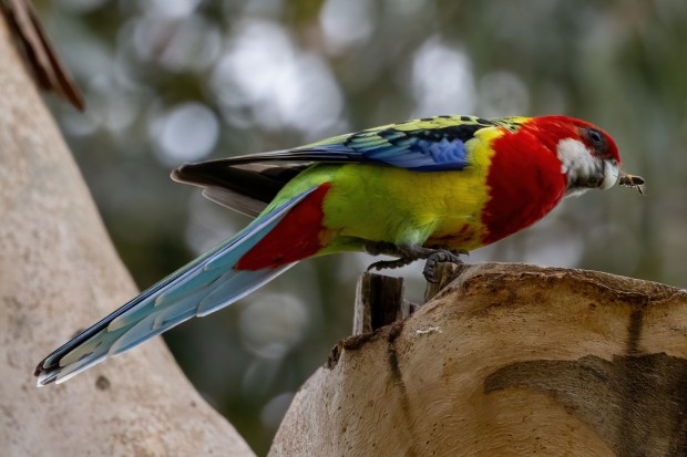 This Eastern Rosella is protecting its territory against a bees invasion.