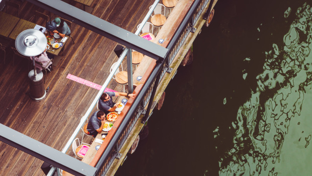 The image was taken from the Storey Bridge looking down at people eating at the Howard Smith Wharf.