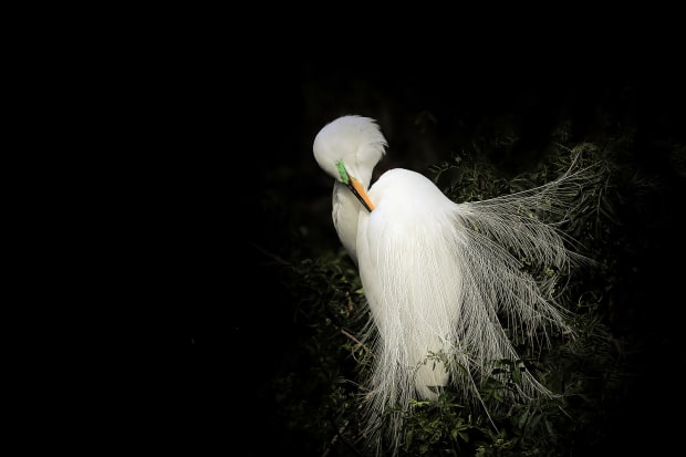 In its breeding plumage, Great Egret preens the delicate ornamental feathers which cover down its back.