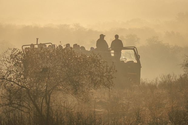 Taken on a recent trip to India. We were on safari in Ranthambore National Park. The early morning sun highlights the fog and dry grasses around the Canter safari vehicle. The guides are scouting for tigers in the scrub.