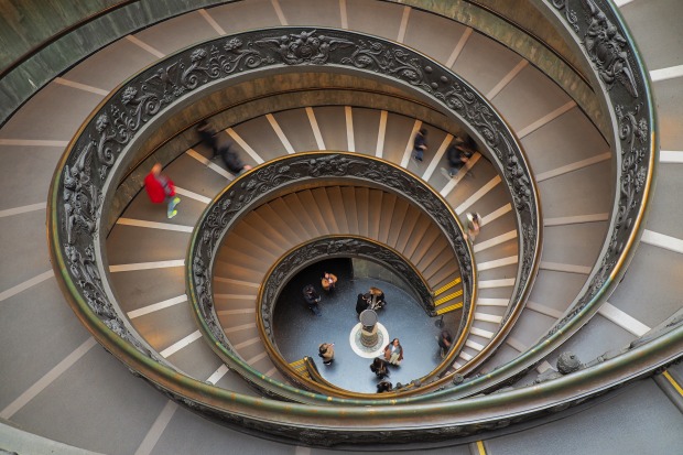 After the treasures of the Vatican Museum, the way to the exit is the beautifully symmetrical spiral stair case, the departing tourists showing as ghostly figures descending the stairs.