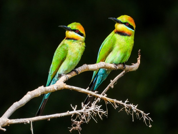 A pair of Rainbow Bee-eater birds on a branch, looking in the same direction and mimicking each other's positions.