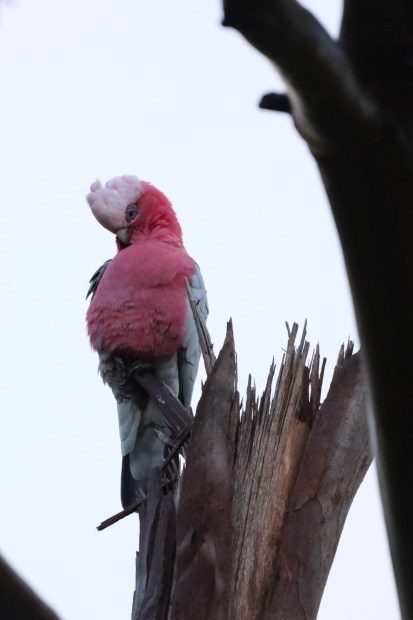 The pink Galah perched on a broken branch