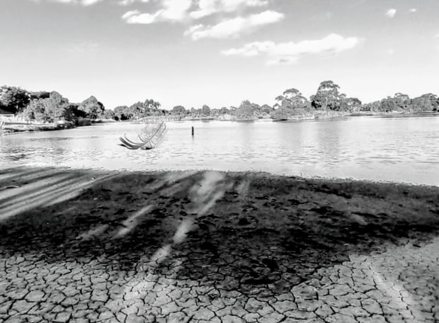 A feather floats past as I take a photo of the drying lake during drought.