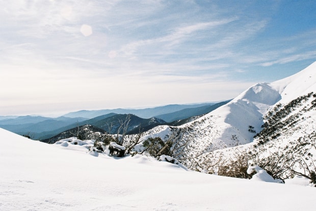 A clear day atop snow capped Feathertop