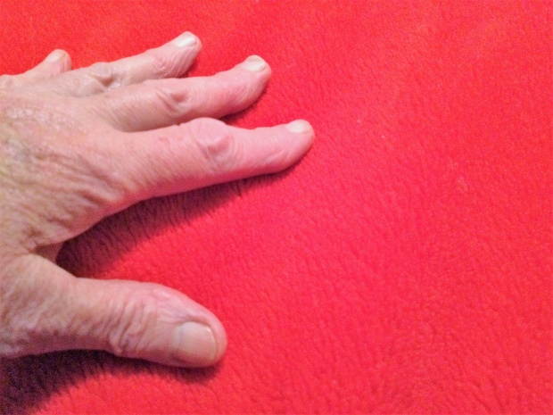 2 types of texture - skin on aging female hands (mine!) and the softness of a (slightly) fluffy red bedspread