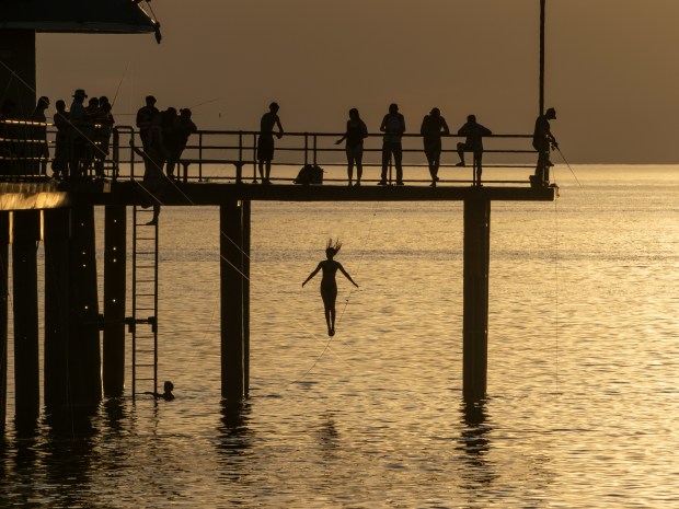 On a hot evening at Brighton Jetty in Adelaide, groups of young people haed to the jetty to cool off. Feet first is a safe way to go as this young diver plummets into the cool water below.