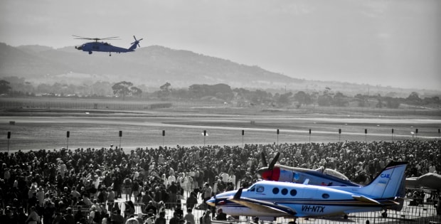 Amidst the buzz of an aviation gathering, aircraft soar and descend, captivating a crowd drawn by the thrill of flight. The colored planes contrast vividly against a monochrome backdrop, symbolizing human ambition and the timeless allure of the sky.
