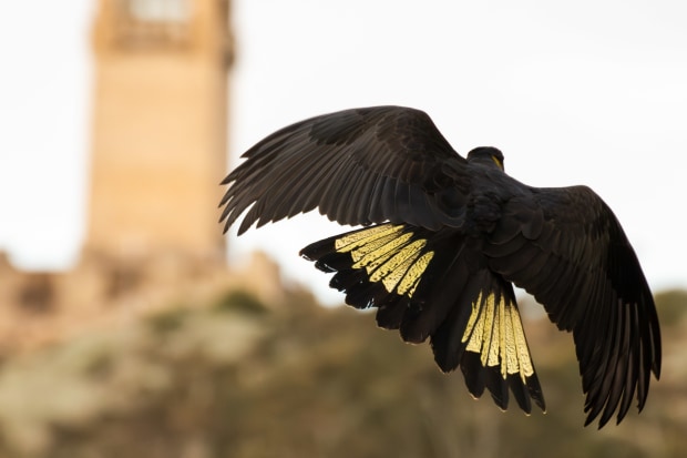 This image captures a moment of pure chance on the outskirts of Goulburn. While observing the landscape, a passing flock of Yellow-tailed Black Cockatoos (Zanda funerea) appeared unexpectedly, making their transit from the Goulburn Wetlands toward the timbered slopes of Rocky Hill. The photograph freezes a split-second of this encounter, catching a single bird with its golden tail feathers fanned wide against the afternoon light—a display often associated in Indigenous tradition with spiritual messages or the coming of rain. In the background, the soft silhouette of the Rocky Hill War Memorial provides a sense of place and history. This landmark stands on a site of deep cultural significance, once serving as a historical 'bora ground' for First Nations people. "Flight to Rocky Hill" is a testament to the sudden beauty of the natural world and the enduring flight paths that connect Goulburn’s modern landmarks with its ancient environment.