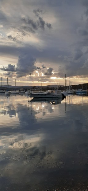Boat with cloud reflections on sunset