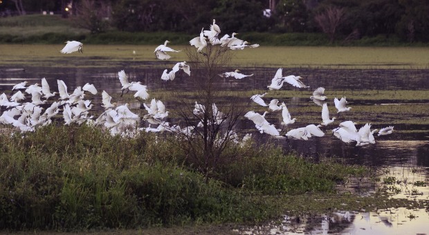 Huge flock of egrets moving as one but not all in the one direction, some appearing uncertain as to where they should fly...hence "Flock of Regrets"