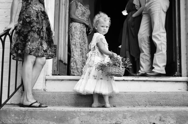 The steely look this little flower girl gives off just burns through the lens. Shooting from her eye level helps to give a glimpse into the curious world of children and what they see.