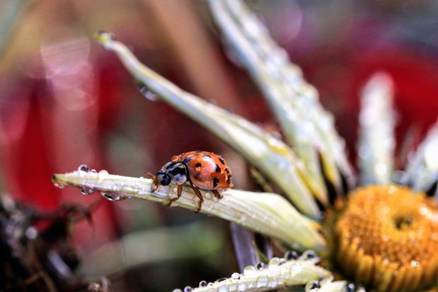 A ladybird on a flower after a shower.