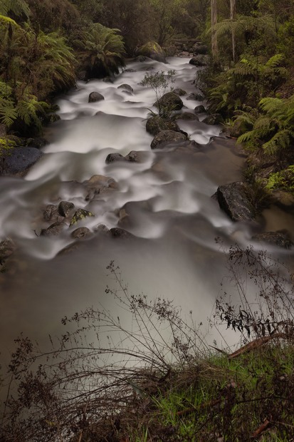 A water fall flowing away and down the stream. A different perspective of a Victorian water fall
