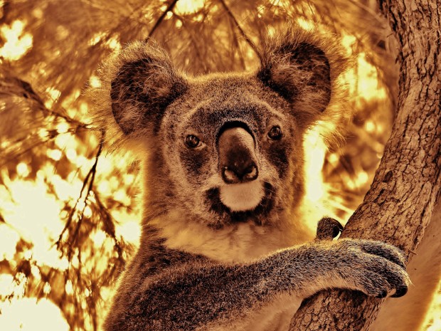 A sepia photograph of a Koala perched in the fork of a tree - bringing awareness to the precious life around us