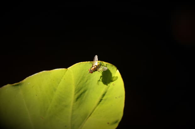 Fly resting on a leaf. If you look at his shadow and the way he is rubbing his forelegs together. Its as if he is up to no good or has just thought of an evil plan.