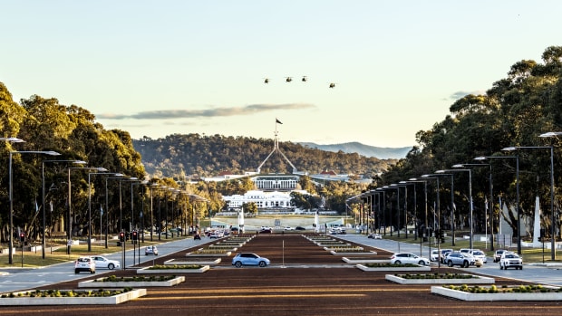 ..over The Australian Parliament House, The Old Parliament House, ANZAC Parade and The Australian War Memorial 18/08/25.