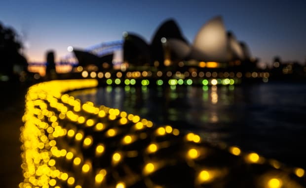 Sydney Opera House and Harbor Bridge from the Botanic Gardens walkway which was covered in a net of yellow lights for Vivid