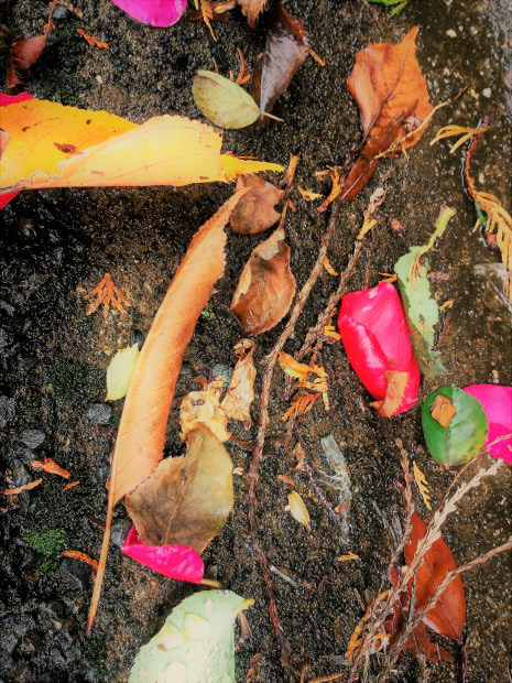 Nature's haphazard arrangement of "forgotten" leaves, petals and debris in an aging concrete kerb creates an amazing textured photo (in my view)