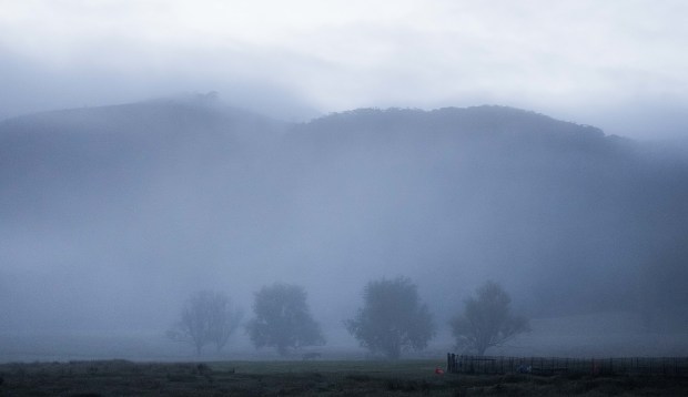 Deep in morning fog, four trees are dwarfed by the hills behind them.