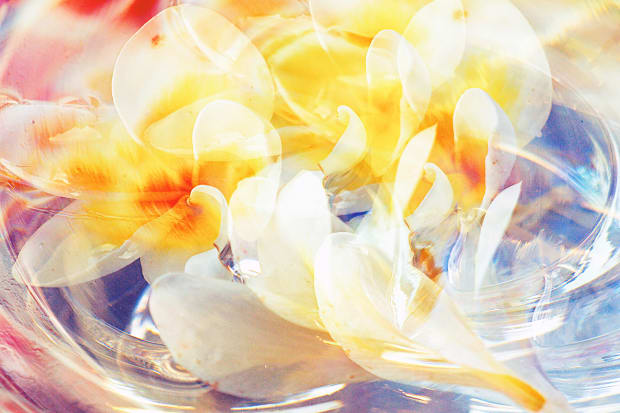 Multiple exposures of this frangipani blossom to give impressionistic effect of detail of many overlapping blossoms.