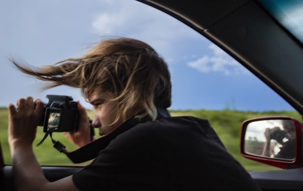 My Grandson capturing images of a storm behind us, the image was too descriptive to miss of this free spirited lad feeling the wind in his hair. A little blurred around the edges, which captures the force of the winds