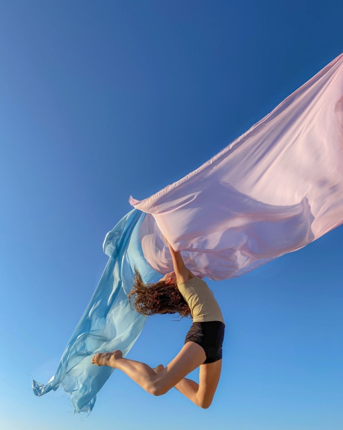 Image of young girl jumping with joy in air surrounded by coloured fabric