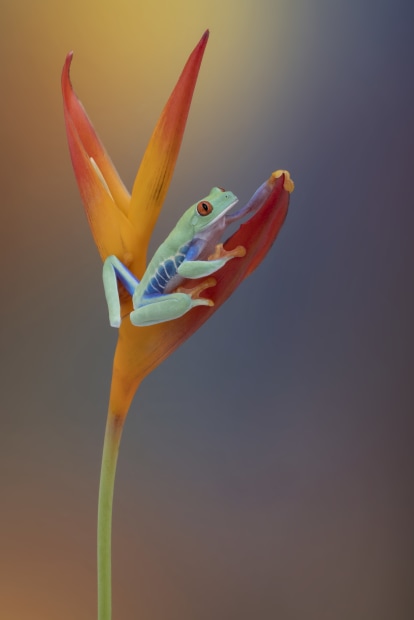 A Red-Eyed Tree Frog on a Bird of Paradise flower