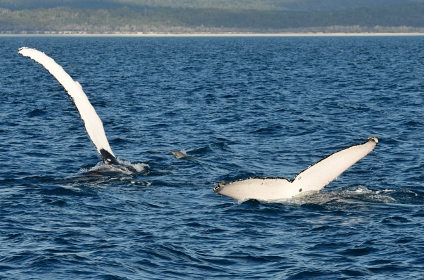 2 whales and a dolphin on whale watching tour in Hervey Bay