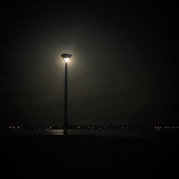 The full moon shining through a lamp post around Lake Wendouree.