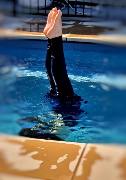 My daughter was supposed to be cleaning the edge of the pool with an old pair of leggings, but decided to put them on instead.
