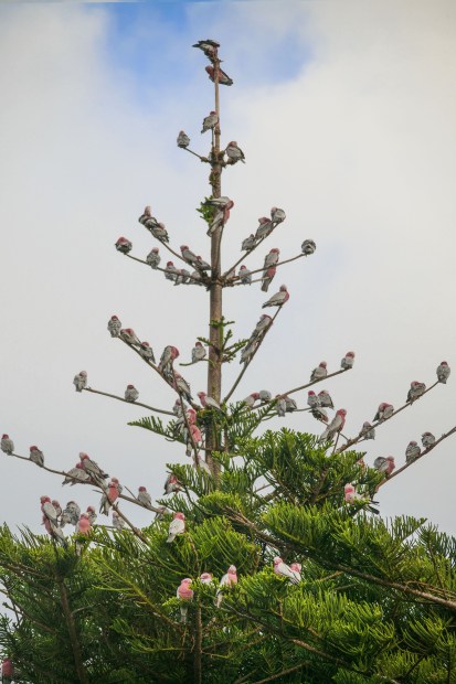 Galahs have chewed off the top of this Norfolk Pine in Kalbarri to provide a roost; they return to it each night.
