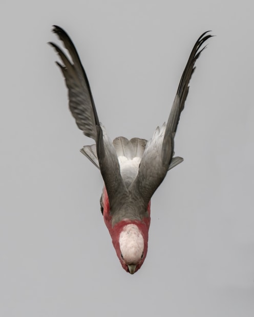 A Galah midflight directly facing my camera appears to be hovering in suspended animation