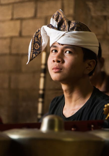 A Balinese teenager relaxes for a moment during a practice with his gamelan orchestra