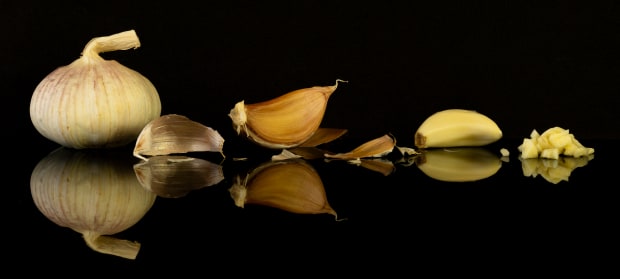 The life of garlic in the kitchen starts as a bulb, and then you peel it to get to the clove before you cut it up. This image shows the life of the garlic from the bulb to the cuttings.