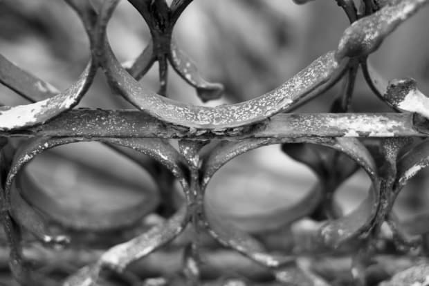 This old gate was leaning against a tree. The patterns in the ironwork fascinated me. The photo works best in black and white.