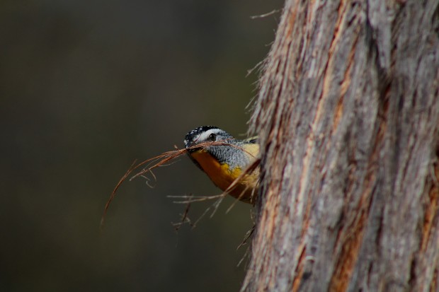 Spotted pardalote collecting tree fibers to take back to the nest. Taken in Warrandyte VIC
