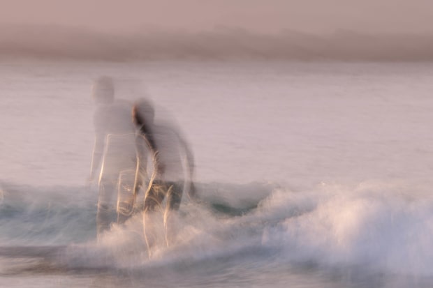 A lone surfer becomes a ghostly figure drifting through the wave.