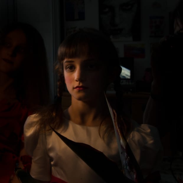 Sophie has just made herself a fringe with nail scissors, to look more like her chosen character for the zombie disco.