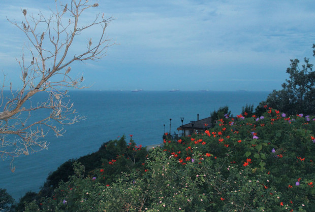 Flowers with a scenic ocean with boats in the background