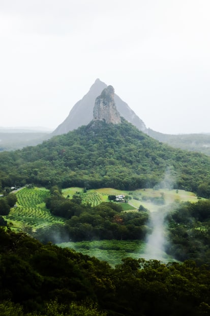 A photo taken of the glasshouse mountains in summer just after rainfall