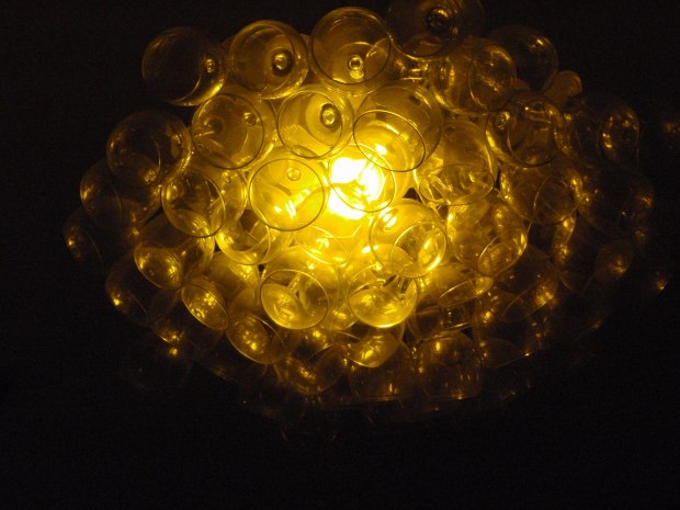 Looking up into a 'chandelier '- taken in a Jewish restaurant, which was filled with 'chandeliers' made from glasses and lit up in different colours.