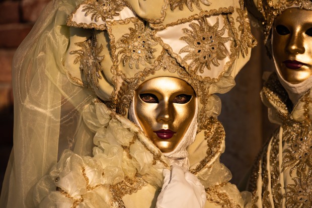 The creams and yellows in the costumes of these models at the Venice Carnival glow gold in the early morning light.
