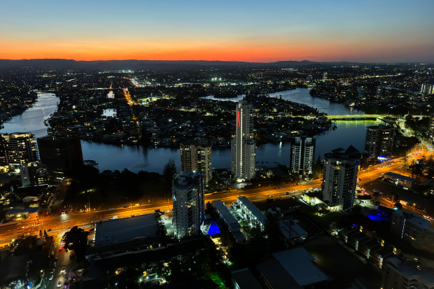 A capture just after sunset of the Gold Coast Highway with the Isle of Capri and the Nerang River in the background.